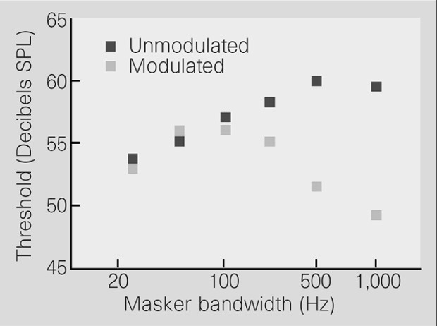 Here is a sound example illustrating the difference in thresholds of a tone in modulated and unmodulated maskers. Start by setting the threshold with the modulation button in the 'off' position. At that sound level, turn the modulation on. Can you hear the tone now?