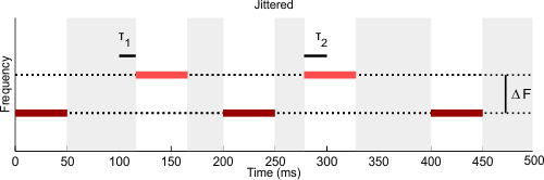 The following demo explores the effect of temporal regularity, or rhythmicity, on stream segregation. It uses the stimuli used in the study by Rajendran and colleagues (2013 JASA-EL).